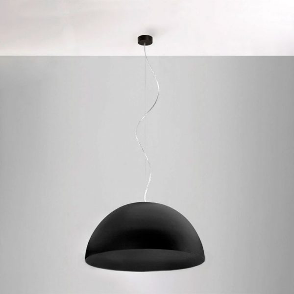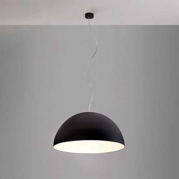 Egoluce Giove lampada a sospensione, design ABS Studio. Lampada di grandi dimensioni (d. 60 cm.) disponibile in quattro finiture: completamente nera (interno ed esterno), completamente bianca, esterno nero e foglia oro interno, esterno nero con bianco interno. Lampadina: n. 1 LED attacco E27 max 18W (sostituibile) – esclusa. La sua forma a mezza sfera e l’utilizzo di diverse tipologie di sorgenti E27 garantiscono gradevoli effetti luce nei diversi ambienti. Giove fa parte della nuova Collezione Egoluce Venti20, lampade dal design essenziale, facili da installare, lampadina sostituibile, Made in Italy. Disponibile anche nel modello a soffitto. Codice prodotto: 1599