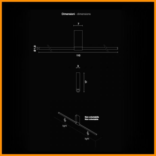 Egoluce Lancia lampada da soffitto LED cm. 110 NON ORIENTABILE a luce diffusa, P. Pepere designer. Corpo lampada in alluminio con diffusore in metacrilato opale, tappi in ABS stampati ad iniezione. Disponibile nel colore bianco opaco, nero e cromato lucido. Led 18W disponibile a 2700K (luce più calda), 3000K (luce calda) o 4000K (luce diurna) CRI>90 – e alimentatore inclusi, LED di elevatissima resa cromatica è alto confort visivo. Essenziale e semplice è la lampada perfetta in qualsiasi ambiente sia moderno che classico. Lancia è una famiglia con molte varianti sia a parete, terra e sospensione.- IP40 – CE – Codice prodotto: 5568