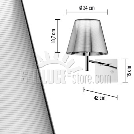• Dimensioni: rosone 150x150 mm. - paralume ø 240 mm. x 187 mm. - altezza totale 350 mm.- sporgenza 420 mm.