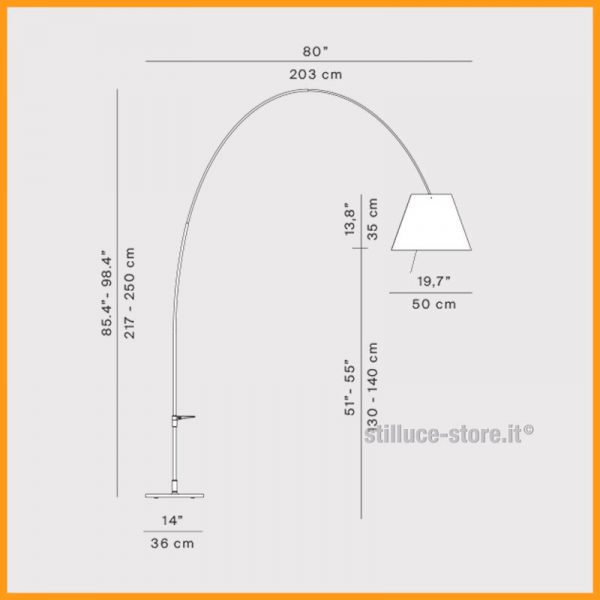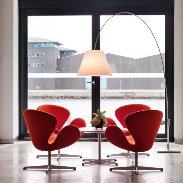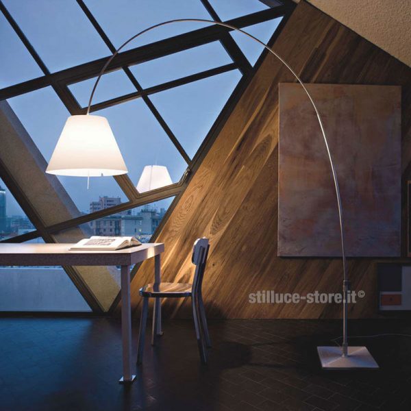 Luceplan Lady Costanza lampada da terra ad arco. Struttura in alluminio o nero e paralume intercambiabile in policarbonato serigrafato. Diffusore disponibile in quattro colori: bianco, nocciola, rosso primario o nero.
