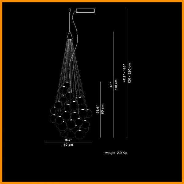 Luceplan Stochastic sospensione a led composta da 48 sfere in vetro soffiato con finitura mirror, non ha una forma predefinita ma è componibile dall’utente a seconda della propria creatività. Lampade da design a kmzero – in offerta. SOLO N. 1 ARTICOLO!