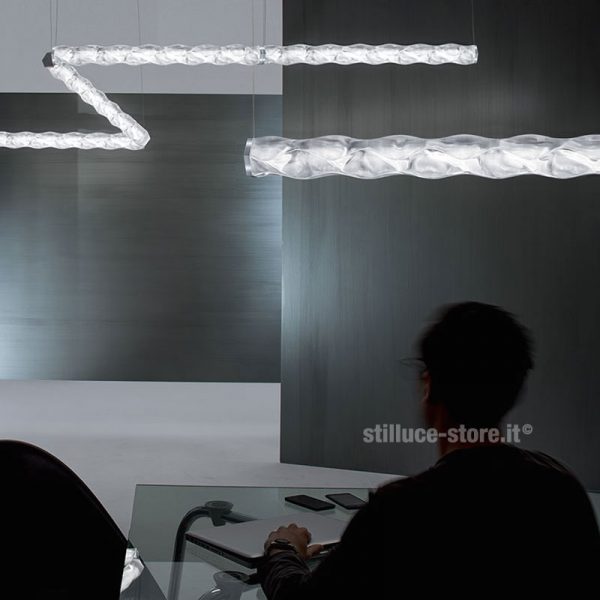 Slamp Hugo lampada a sospensione in lentiflex nel colore prisma. Un disegno sinuoso che si unisce alla morbidezza dei led.